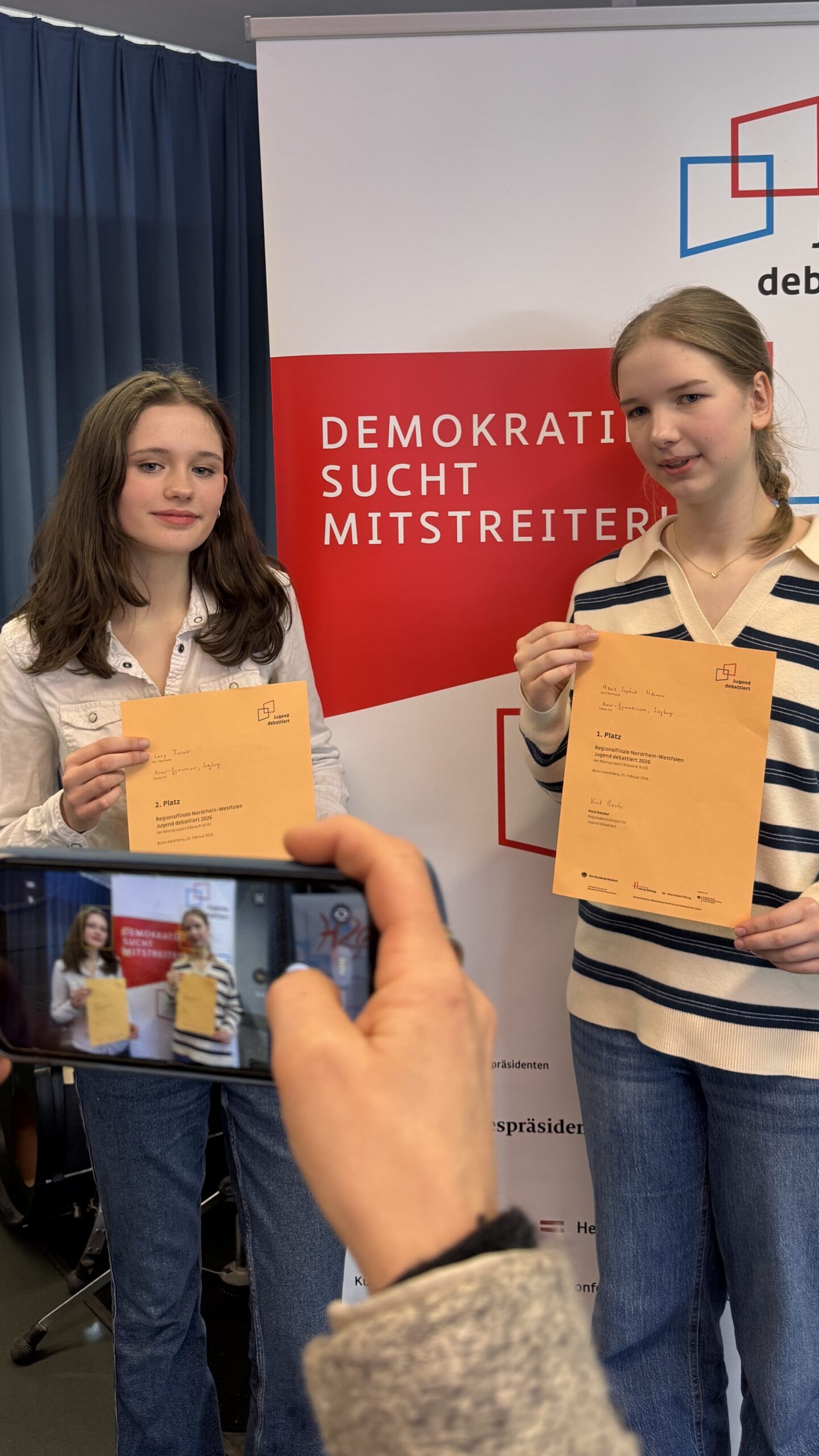 Unsere beiden Schulsiegerinnen Lucy Turner (10e) und Marie Sophie Heinen (10d) traten am 25.2.2026 beim Regionalwettbewerb Jugend debattiert am Hardtberg-Gymnasium in Bonn an. Nick Oschlisniak (9b) ist für eine nicht erschienene Teilnehmerin einer anderen Schule nachgerückt. Benedikt Schneider (10b) hat den Wettbewerb als ausgebildeter Jurorunterstützt.
