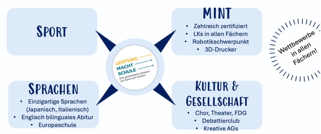 Die vielfältigen Auszeichnungen verdeutlichen, wie breit wir am Anno-Gymnasium in den Bereichen Sprachen, MINT, Kultur und Gesellschaft sowie im Sport fördern und fordern. Über all dem steht die Initiative „Leistung macht Schule“, in der wir Kinder mit besonderen Begabungen in individueller Betreuung mit spannenden Forschungsaufträgen in ihrer einzigartigen Entwicklung unterstützen. Zudem bieten wir in allen Fächern Wettbewerbe zur intensiveren Beschäftigung mit den besonderen Interessen Ihres Kindes an.