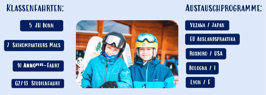 Das Anno bietet außerhalb des Unterrichts noch viel mehr, ohne dass Ihr Kind auf Klassenfahrt fahren muss. Der schulische Alltag ist geprägt von regelmäßigen Veranstaltungen und liebevoll geplanten Aktionen. Dazu gehören der jährliche Kulturabend, die Theateraufführungen verschiedener Jahrgangsstufen über Abschlussbälle, das Annonianerfest und der berühmte Spendenlauf, bei dem zahlreiche prominente Siegburger mitlaufen.