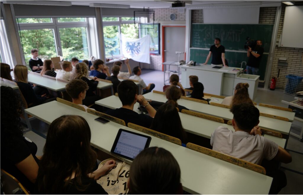 Nicht zu vergessen sind auch die vielfältigen Aktionen der Schülervertretung, die über das Jahr verteilt stattfinden. Zudem hat das Anno 2024 bereits zum dritten Mal das Großprojekt „Schule als Staat“ auf die Beine gestellt. Hierbei wurde die Schule zu einem von den Kindern selbst entwickelten und organisierten Staat mit eigener Währung, Politik und Wirtschaft. Ein spannendes Projekt, bei dem Ihr Kind ganz individuelle und wichtige alltagstaugliche Erfahrungen machen kann.